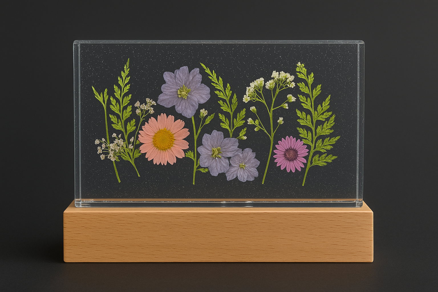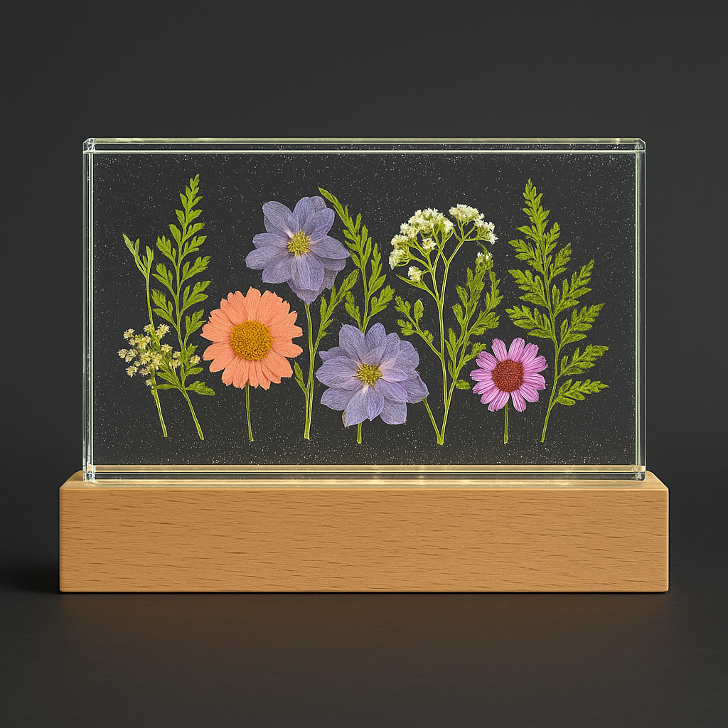 Bloemen in epoxy. op een houten blokje met LED-verlichting met USb stekker.