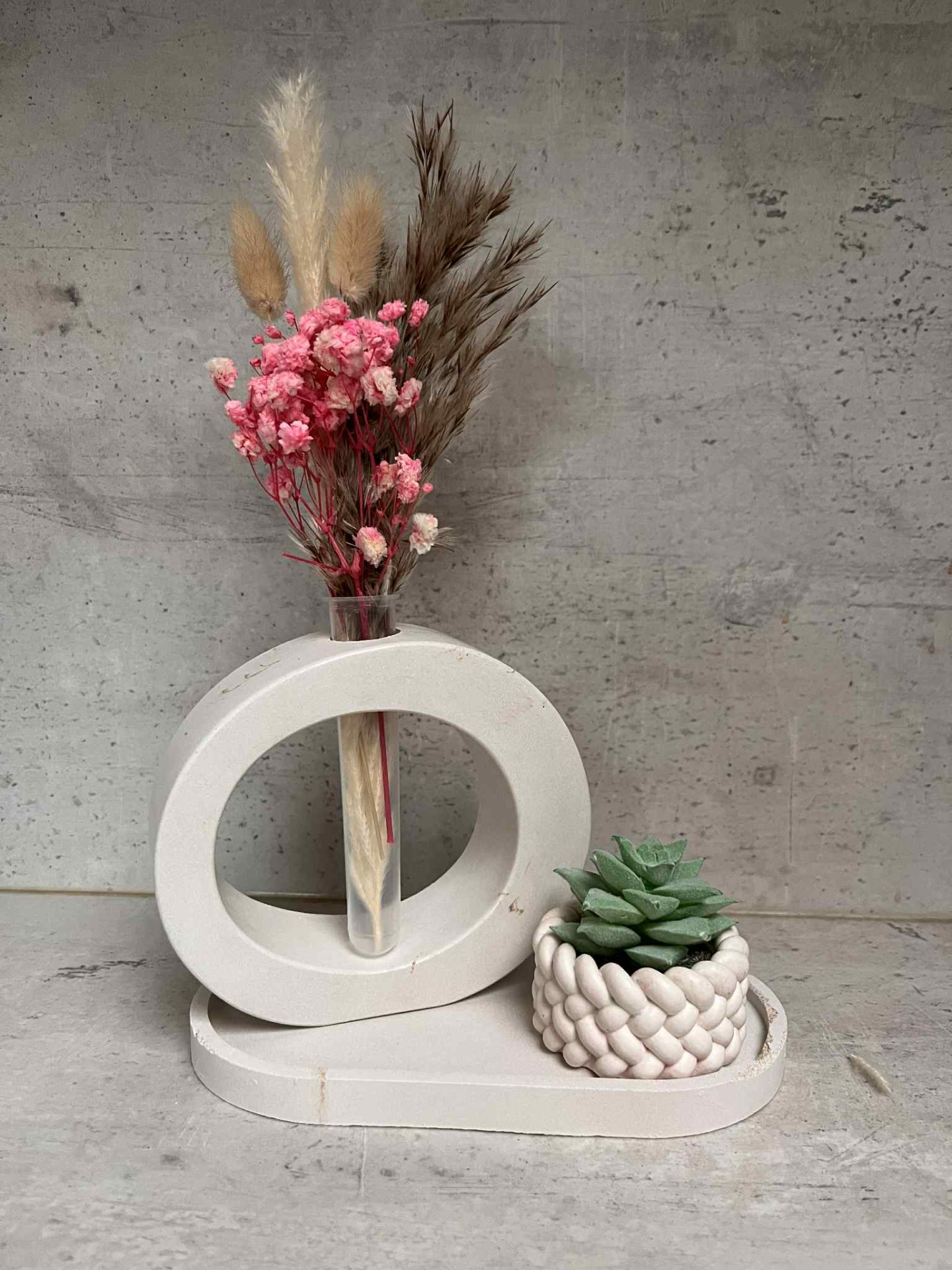 Handgemaakt Jesmonite decoratiesetje in zachte nude tinten, met elegant vaasje en mini-(kunst)plantje. Een subtiel en modern accent dat perfect past in elk interieur.