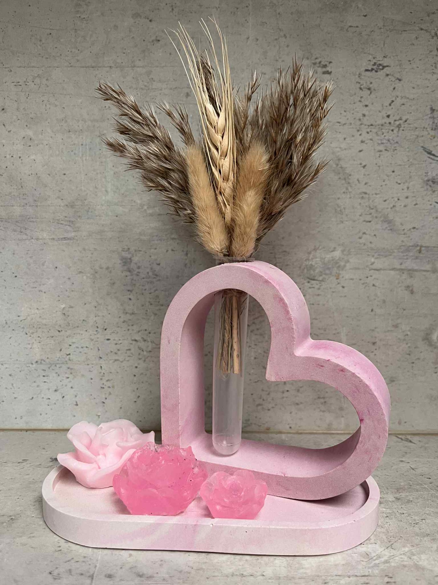 Liefdevol handgemaakt Jesmonite decoratiesetje in zachte roze tinten, met hartvormig vaasje, droogbloemen en bijpassende zeepjes. Een elegant, uniek en romantisch accent voor elk interieur.