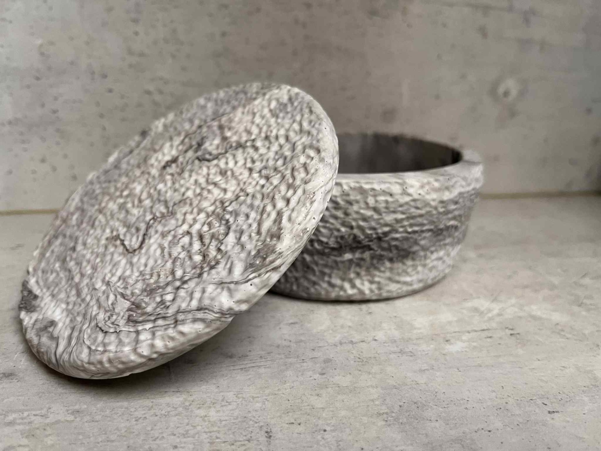 Dit unieke bewaardoosje in jesmonite heeft een prachtig organische structuur en natuursteenlook. Ideaal voor sieraden, kleine spulletjes of gewoon als stijlvol decoratiestuk. Elk stuk is volledig handgemaakt en daardoor one-of-a-kind.
