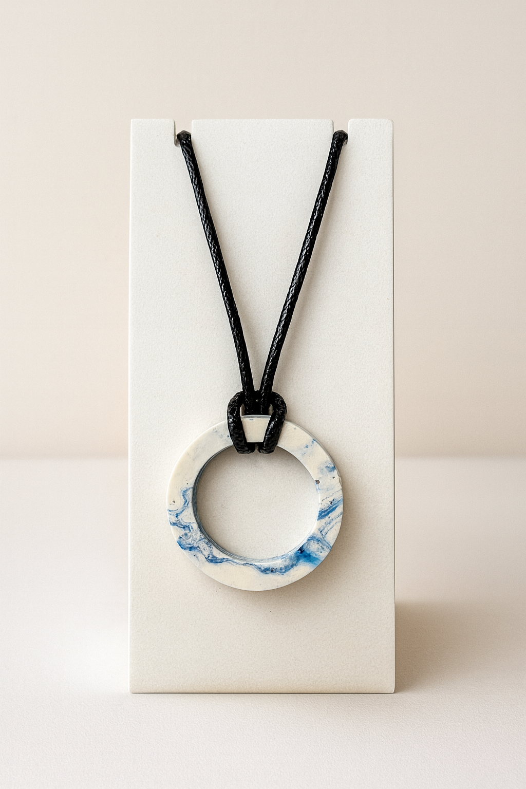 Stijlvol en lichtgewicht Jesmonite hangertje met een uniek blauw marmerpatroon. Elk stuk wordt met de hand gegoten, waardoor geen enkel hangertje hetzelfde is. Afgewerkt aan een stevige, zwarte koord.
