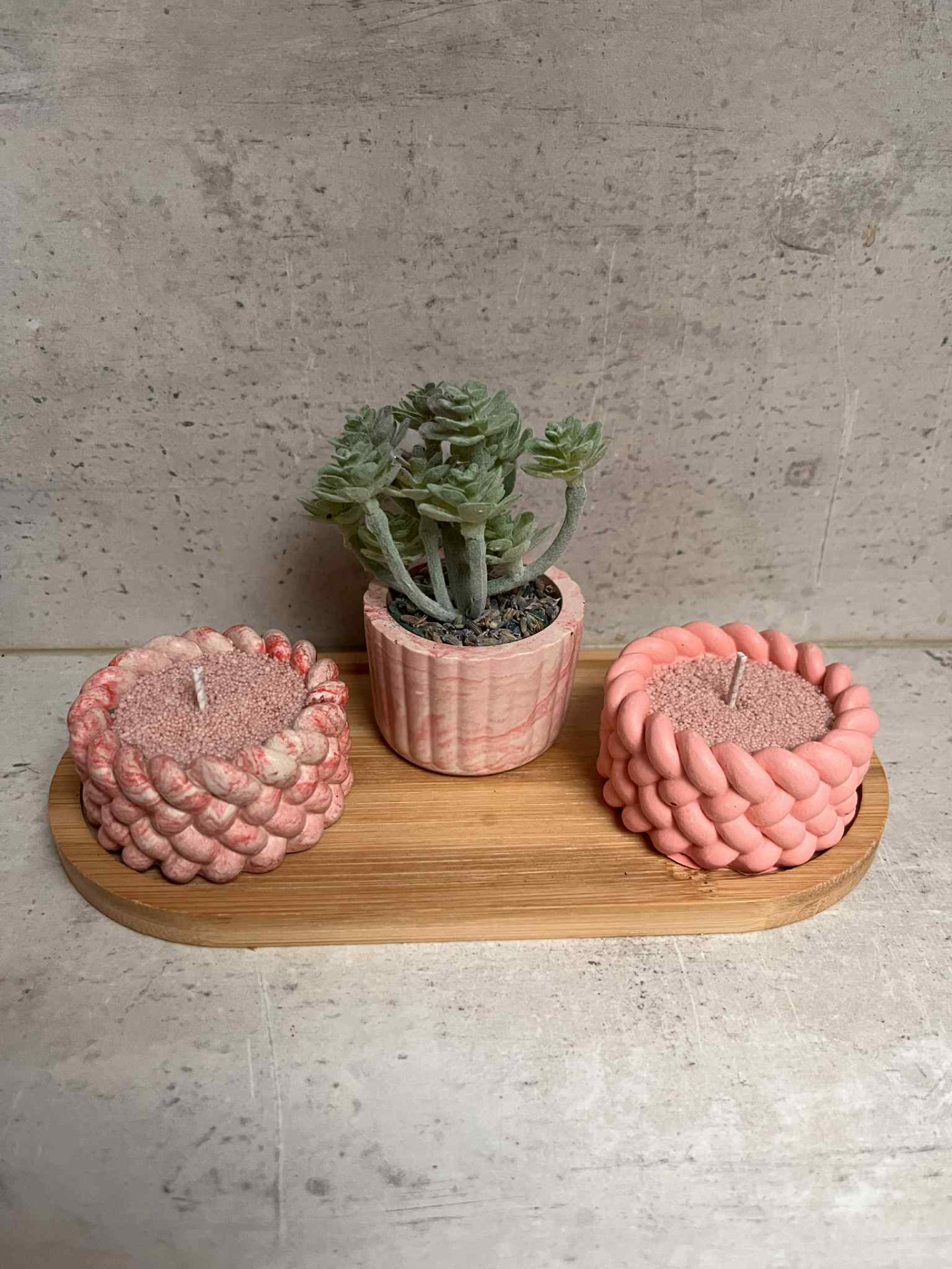 Sfeervolle decoratieset met twee handgegoten jesmonite kaarsenhouders gevuld met kaarsenzand en een bijpassend potje met een stijlvol kunstplantje. Een zachte, elegante toevoeging aan elk interieur – perfect als cadeau of subtiele eyecatcher in huis.