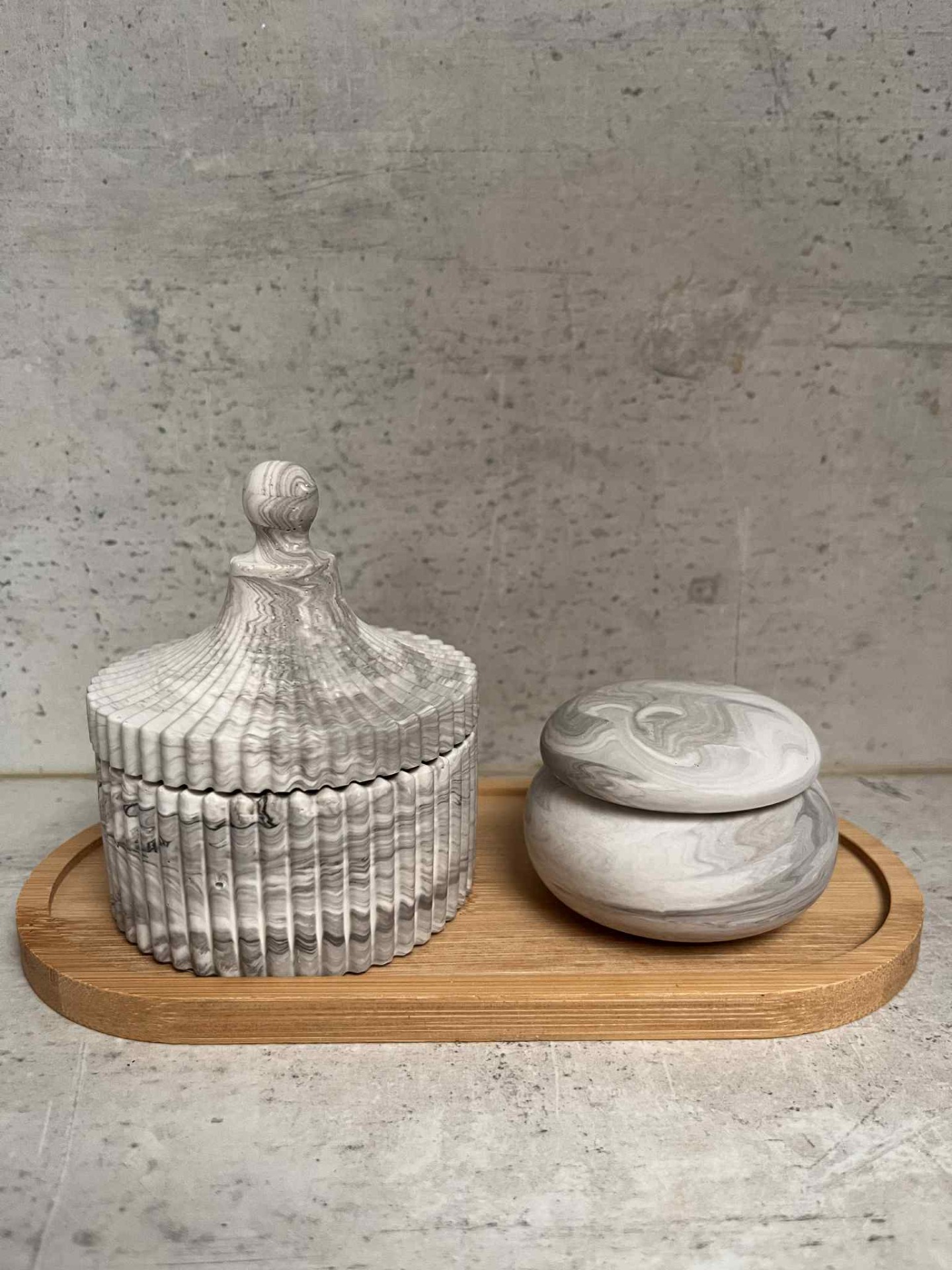 Stijlvolle decoratieset bestaande uit twee elegante jesmonite potjes met uniek marmerpatroon, gepresenteerd op een tijdloos bamboe plankje. Perfect voor het opbergen van kleine items of als verfijnde blikvanger in elk interieur.