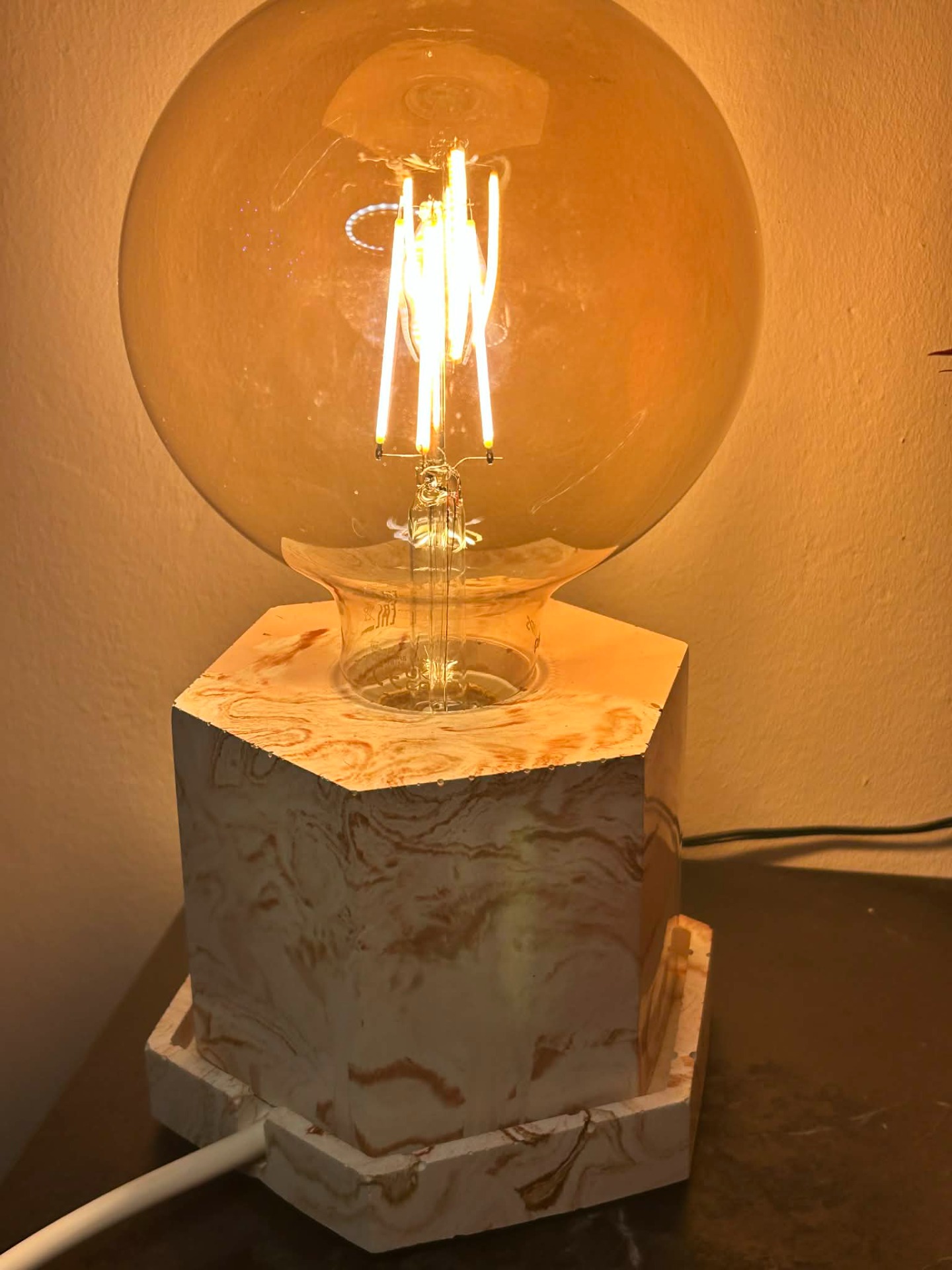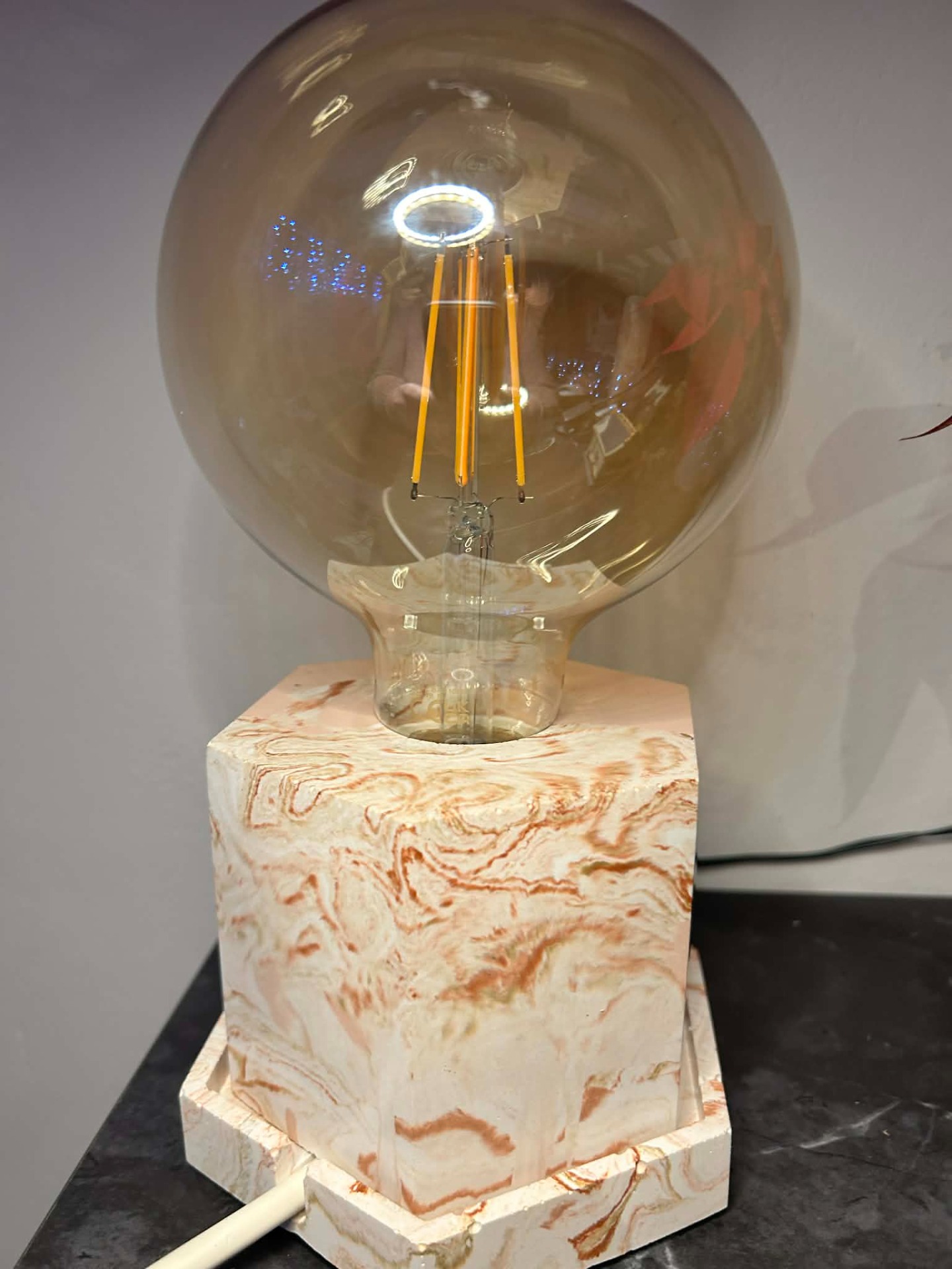 Unieke tafellamp met een robuuste jesmonite voet en een warme decoratieve lichtbron. Het zachte marmerpatroon maakt elke lamp one-of-a-kind en zorgt voor een gezellige, moderne sfeer in elk interieur.