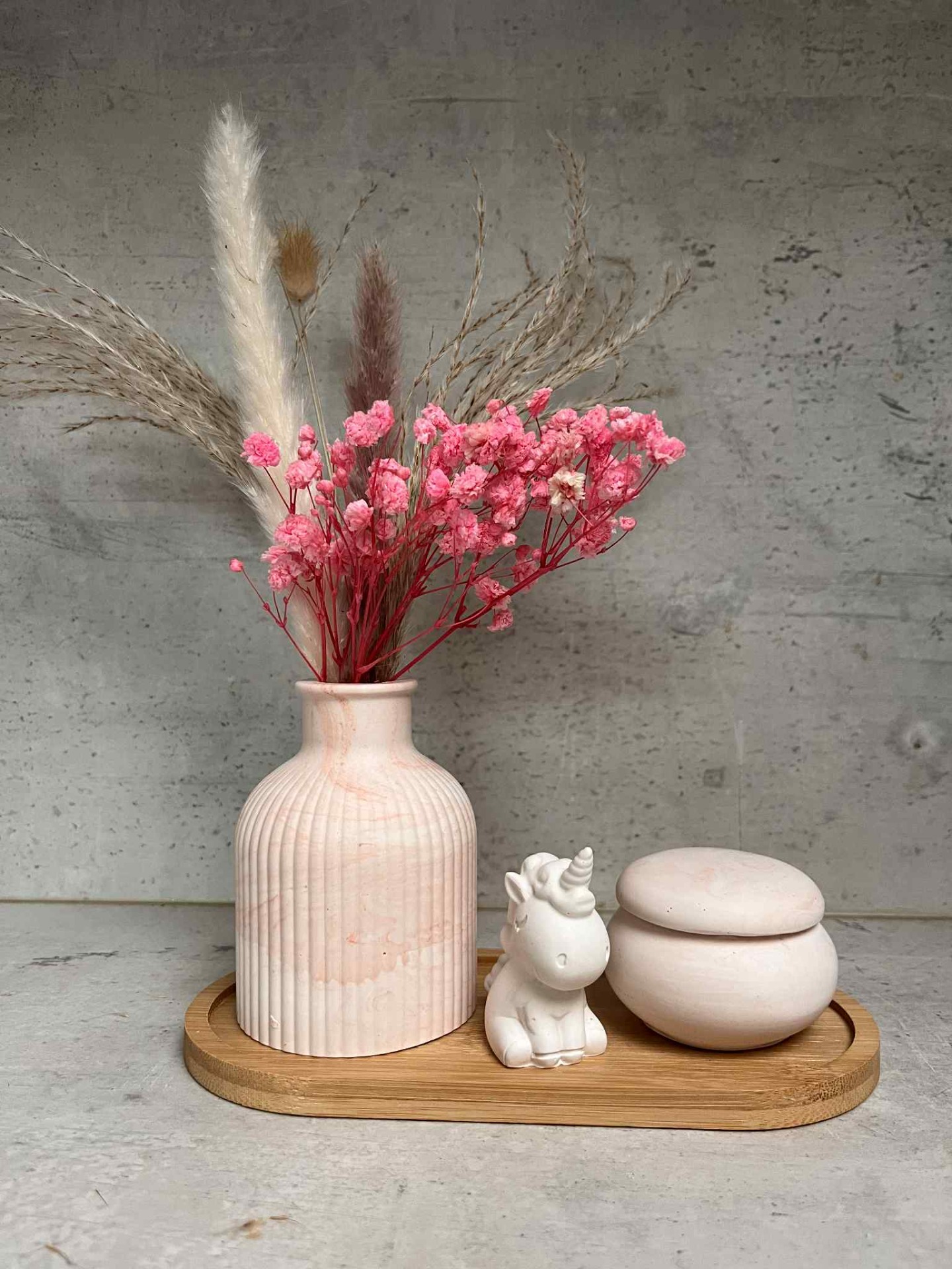 Lief pastelroze decoratiesetje met Jesmonite vaasje, unicorn-figuurtje en bijpassend bewaarpotje op een bamboe tray. Perfect voor een zacht, speels accent in elk interieur.
