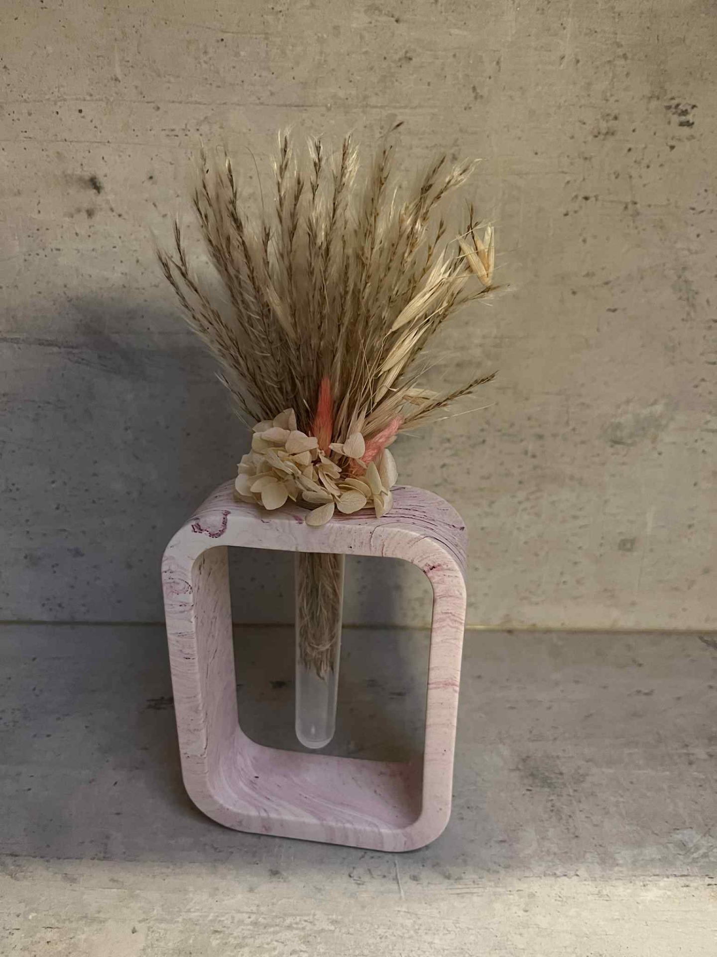 Elegant rechthoekig vaasje in marmer-look Jesmonite, afgewerkt met zachte roze tinten en een subtiel droogboeketje. Een stijlvol en tijdloos decoratiestuk voor elk interieur.