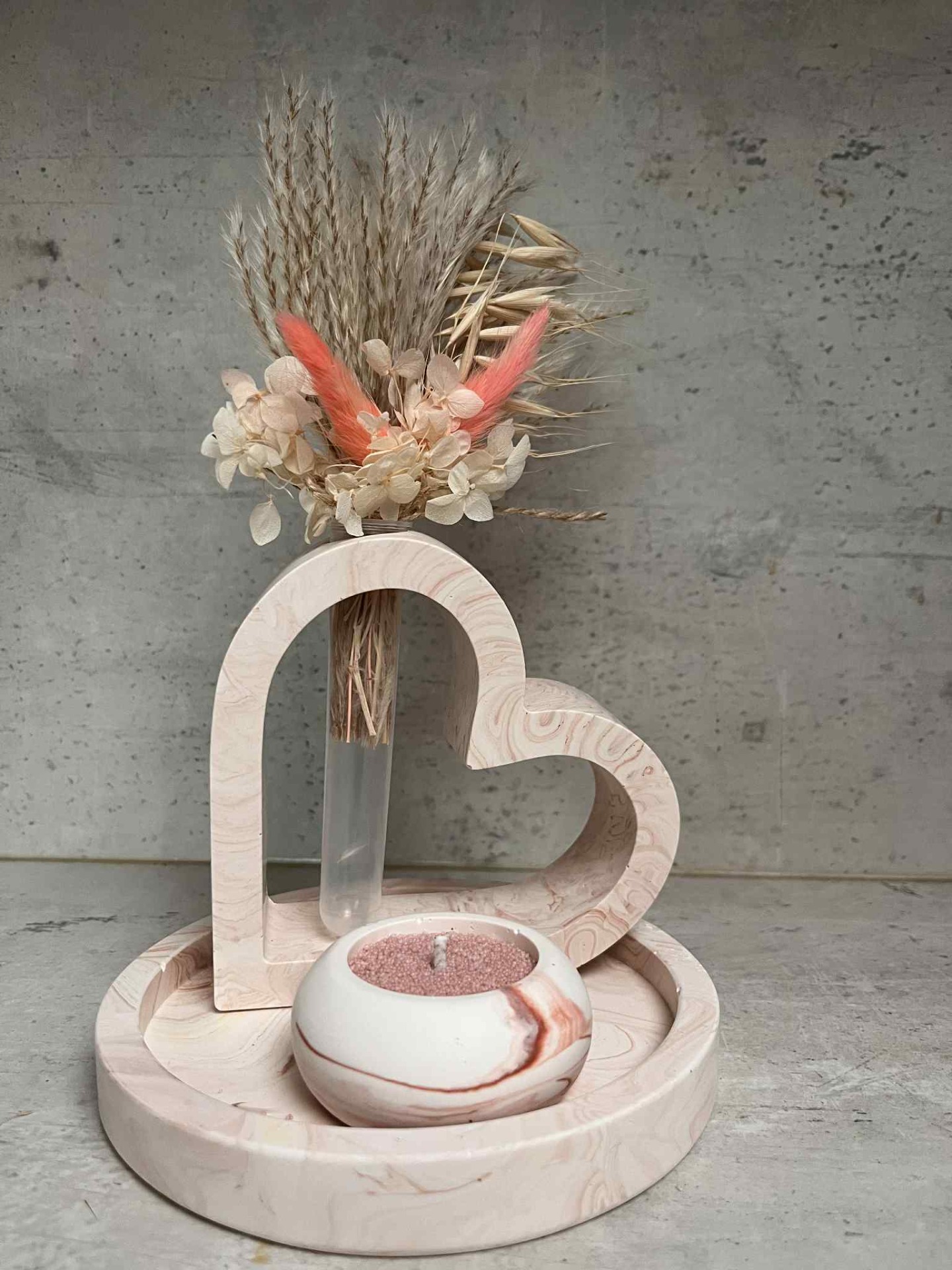 Romantisch Jesmonite decoratiesetje in marmerlook, met hartvormig vaasje en bijpassend theelichthoudertje. Een zachte, elegante toevoeging aan elk interieur.