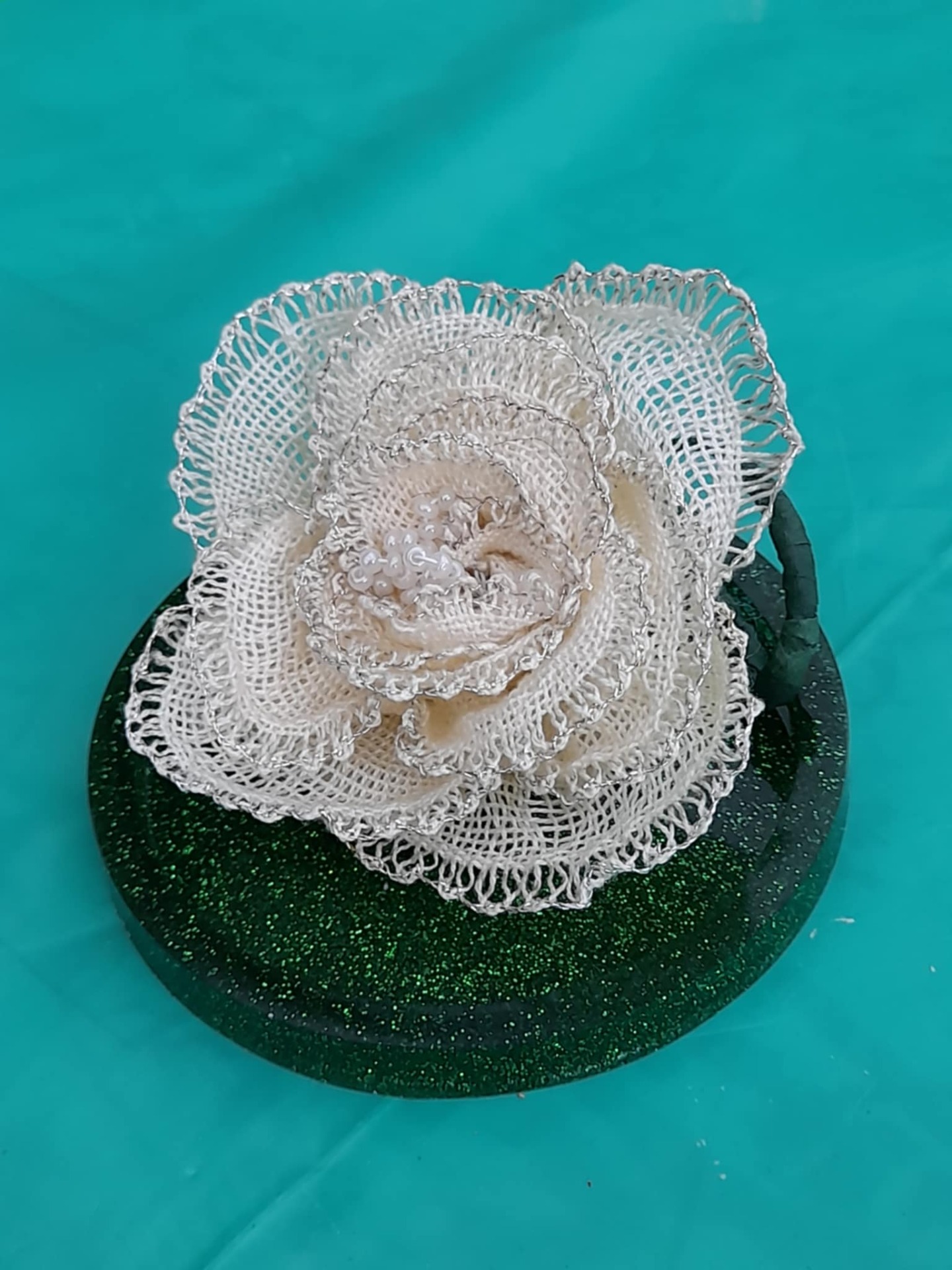 Wit roosje in Brugse Kant, geplaatst op schaaltje van Resin