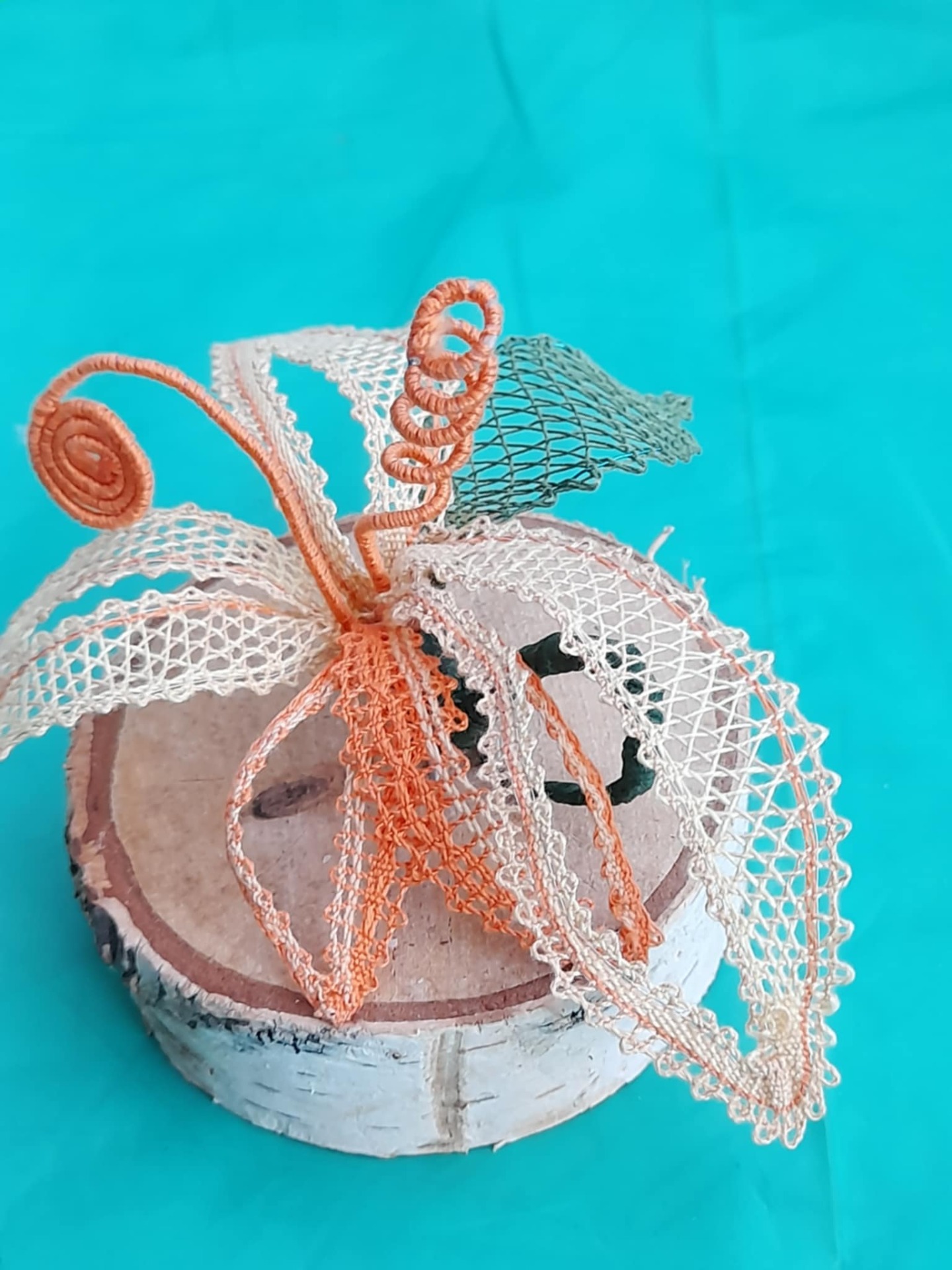 Witte lelie in Brugse Kant, geplaatst op een houten blokje
